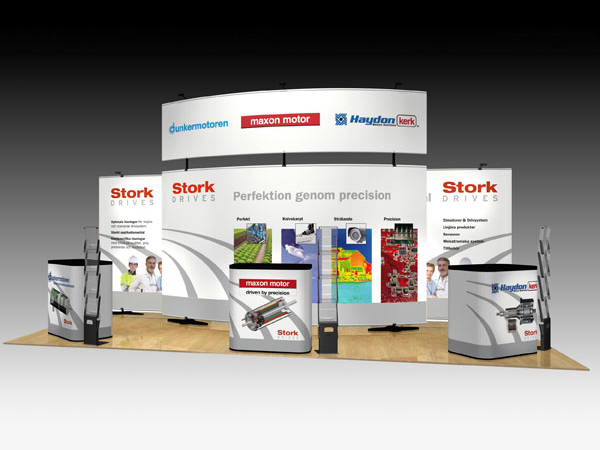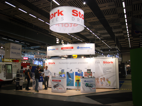 Stork Drives provides drive technology components and systems up to 500 W output power, the booth needed to show of their focus on quality, performance and flexibility.